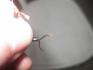 The end of this wire is now solderable. However, I've found it doesn't take the solder well at all because of the material. An optional step now, which will improve your chances of getting a good solder joint, is to take a single strand from a normal wire. These strands are a silver colour, not copper. Take a strand and carefully wrap it round and round the copper strands, working your way right up to the tip. You'll have something that looks like this when you're done: