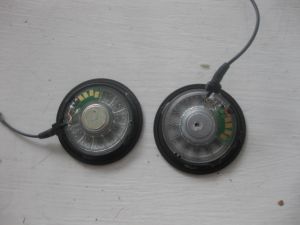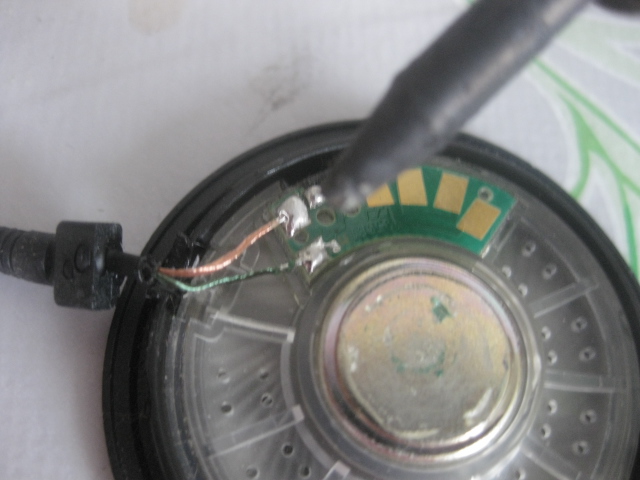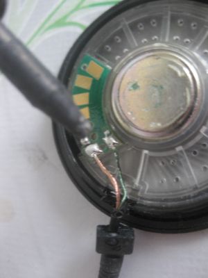 Now you're ready to solder the wires onto the speakers with a blob of solder, just on the exposed tip of the wire. The coloured wire is closest to the centre. Again, I've done a messy-looking job here, but it's electrically sound, and that's the main thing.