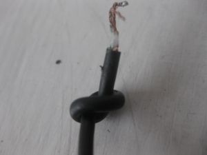 Next, tie a small knot as close to the end of each of the wires as you can. This knot we will leave inside the speaker unit so that if the cables get pulled, the stress goes on the knot, not on the solder joint.