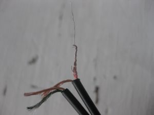 At the one end of the cable we want to solder a new plug. I had a spare Neutrik plug, used before but still salvageable. The problem with the type of wire that is used on headphones is that the strands in the wire are coated with a lacquer which can't be soldered directly. There is also a fibre-glass type fuzzy core, around which the strands of wire are wrapped. What we have to do is strip away the lacquer and remove the fuzzy core. You can just about see the red lacquer and white core here: