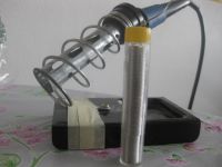 The end of this wire is now solderable. However, I've found it doesn't take the solder well at all because of the material. An optional step now, which will improve your chances of getting a good solder joint, is to take a single strand from a normal wire. These strands are a silver colour, not copper. Take a strand and carefully wrap it round and round the copper strands, working your way right up to the tip. You'll have something that looks like this when you're done: