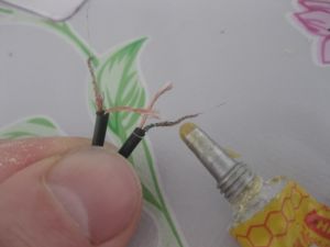 Next, tie a small knot as close to the end of each of the wires as you can. This knot we will leave inside the speaker unit so that if the cables get pulled, the stress goes on the knot, not on the solder joint.