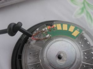 Now you're ready to solder the wires onto the speakers with a blob of solder, just on the exposed tip of the wire. The coloured wire is closest to the centre. Again, I've done a messy-looking job here, but it's electrically sound, and that's the main thing.