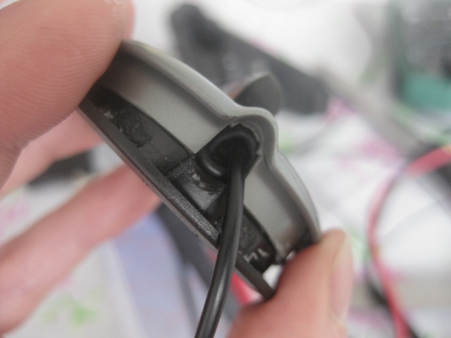 Next you need to lever the black cover off the grey body with the tip of a strong knife. Insert the knife above where the cable enters the unit and gently try to prise a little space free between the two parts.